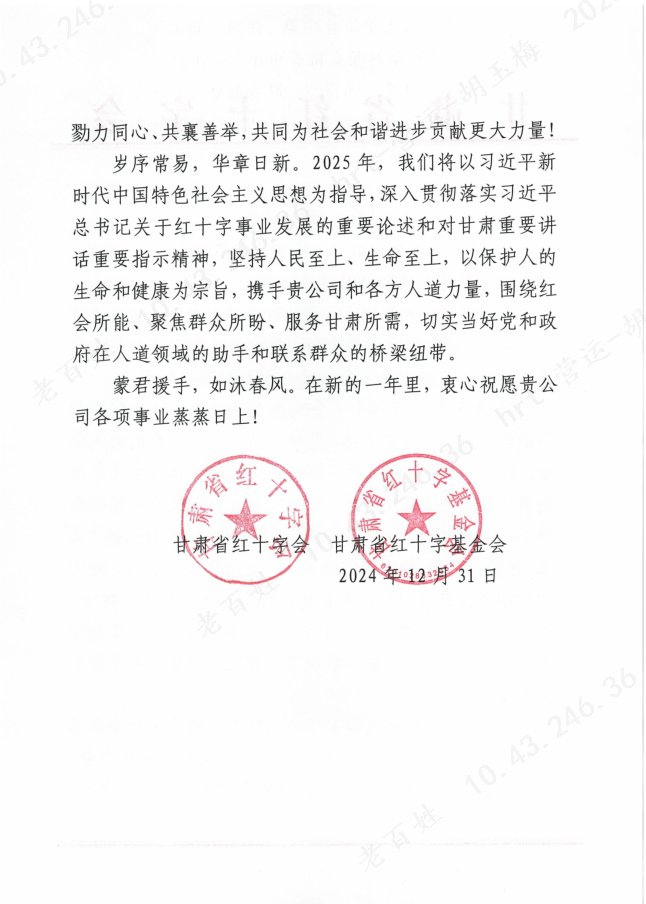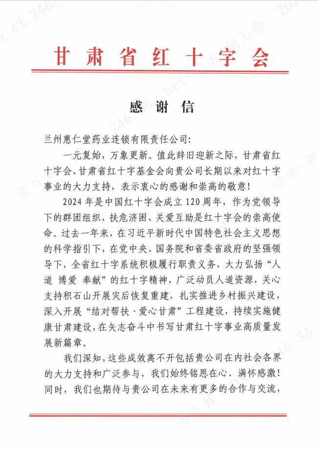 近日,蘭州惠仁堂藥業(yè)連鎖有限責任公司(以下簡稱“老百姓惠仁堂藥房”)收到了來自甘肅省紅十字會的感謝信,信中高度贊揚了老百姓惠仁堂藥房在2024年度對公益慈善事業(yè)所做出的杰出貢獻。這一榮譽不僅是對老百姓惠仁堂藥房長期以來積極參與社會公益活動的肯定,更是對公司深厚社會責任感的高度認可。